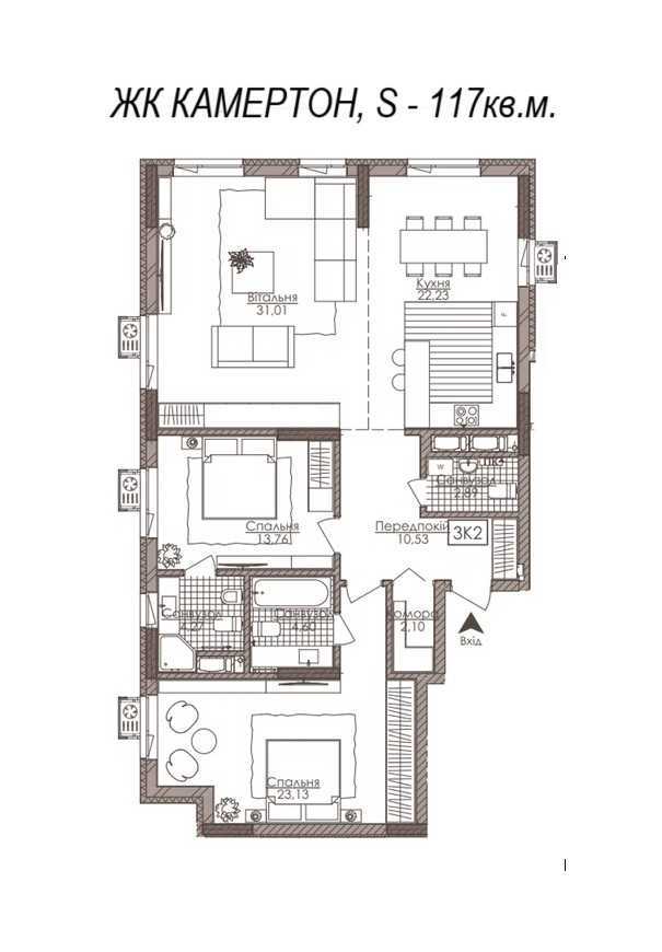 ЖК КАМЕРТОН, вул.Річкова (Річна), 4. Будинок бізнес рівня, розташований у Шевченківському районі, на перетині двох вулиць - Дмитрівська та Річкова, в тихому центрі міста. ЗАГАЛЬНА площа - 117кв.м. Н -3м Передпокій - 10.9кв.м. Комора -2.4кв.м. ЖИТЛОВА - 65кв.м. ТРИ окремі кімнати - 23.5кв.м., 14.1кв.м., 27.4кв.м. КУХНЯ - 26.5кв.м. Три санвузли - 4.8кв.м. + 4.4кв.м. + 3.0кв.м. Монол.-каркасний будинок, утеплений фасад. Затишний хол першого поверху з каміном, - висока стеля, та оздоблення з якісних матеріалів. Територія розділена на активну та тиху зону. Будинок має внутрішній сквер. Цілодобова охорона, система відеонагляду. З поверху на ліфті можна потрапити в паркінг, - станція зарядки для автомобілів, велопарковка Сучасні безшумні три ліфти *Kone* Розвинена інфраструктура. Поруч розташовані супермаркет, кафе, банки, дитячий садок, гімназія. Найближчі ст.метро - Лукянівська, Вокзальна, Політехнічний інститут . Будинок введено в експлуатацію, можливість відразу зайти на ремонт квартири... В наявності паркомісце для автомобіля. (У вартість не входить) ПРОПОЗИЦІЯ АКТУАЛЬНА. Вартість - 1.950у.о/кв.м. / 063/356-8985 Перегляд по домовленості, телефонуйте у будь який час.
